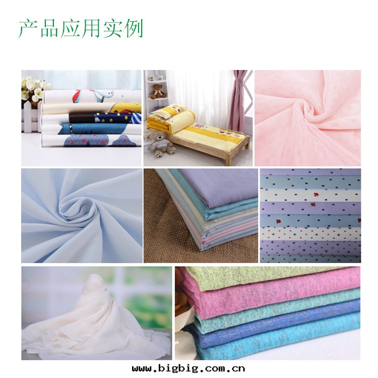 本(běn)産品主(zhǔ)要是(shì)用(yòng)于(yú)純棉(mián)、滌綸及(jí)其(qí)混紡织物(wù)的上(shàng)漿後(hòu)整理(lǐ)劑,使用(yòng)後(hòu)賦予织物(wù)柔软(ruǎn)、蓬松的手(shǒu)感(gǎn),回(huí)彈性(xìng)好(hǎo)。無黃變(biàn),对(duì)色(sè)光(guāng)及(jí)牢度(dù)無影響。